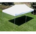 White frame tent 30'x30'. Stakes and ropes stay close to poles to make ...