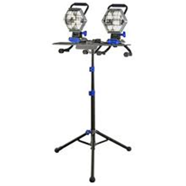 Work light twin tower on stand. Has two adjustable light. Connect to standard 110 plug in.