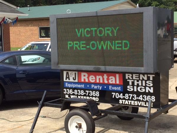 Competition today is fierce; let your business stand out by utilizing the premier in the advertising industry: the portable LED full color sign. It is a state-of-the-art advertisement tool that is double faced, measures 3 feet tall by 6 feet wide, and is sure to catch all potential clients' full attention. Develop your advertisement for a unique program fashioned to your taste. Trailer mounted 3’ x 6’ LED • 48 x 96 Pixel Matrix • Full Color - Text, High Resolution Pictures and Video Capable • Pre-Program Prior to Rental • Removable Tongue for Security • Wireless Programming • Power Cord and Disconnect Included • MET Listed and Labeled • Super Low Power Consumption SIGN TYPE P16 Pixel Pitch 16mm Resolution (Real) 48 x 96 Module Configuration 1R1G1B Module Resolution 16 x 16 Brightness >8500 nits Sign Colors 28.1 Trillion Refresh Frequency 720 Hz Cabinet Material Steel Viewing Angle H 140/V 60 Cabinet Weight 200 lbs Power Consumption Max 1.5 kw Power Consumption Avg 0.5 kw Working Voltage 110 V Certification MET