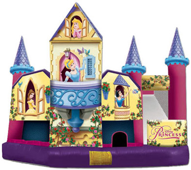 With its sweet 3D imagery, this licensed 5-in-1 combo-style bounce house is a home for classic princesses Belle, Snow White, Cinderella and Sleeping Beauty. Girls will enjoy reigning over their castle, while boys can play the part of the gallant princes! This combo-style bounce house features a realistic 3D balcony for Cinderella.
