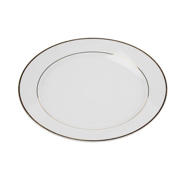 White 10 1/2'' dinner plate with gold rim.