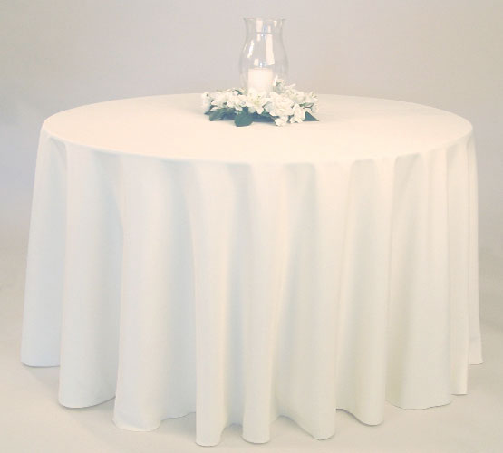 White 90'' round linen drops off the table 15'' (lap length) if use on 5' round table. Other colors are available. Call for colors and price quote.